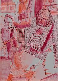 Lorsque l'on rentre, il y a de l'excitation dans l'air. La galerie est en effervescence, pleine de monde… et d’œuvres ! C'est le genre de vernissage où l’on ne sait plus où donner de la tête. Tu fais les premières bises, échanges quelques phrases rapides, et déjà, du coin de l’œil, tu prends mesure de l’ampleur du travail de Nils Dieu, artiste mis à l'honneur à FRACAS durant le mois de février. Il y en a partout : des dessins accrochés aux murs, rangés dans des classeurs petits et grands formats, des céramiques, des tee-shirts. À gauche en entrant, une série de scènes de vie surgies de l’imagination de l’artiste. Sur l’entièreté du mur de droite, des portraits difformes qui t'observent et qui attendent la même chose en retour. Et, croyez-le ou non, ce n’est que le début : l’envie d’en apprendre davantage sur l’artiste et son travail est immédiate.