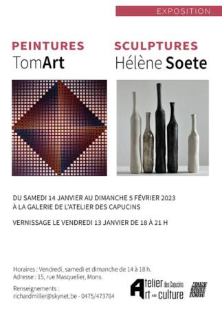 Tous deux présentant, (de prime abord seulement), une certaine inclination à l’uniformité. Le travail du peintre TomArt s’apparente à celui d’un moine bénédictin (ce qui est, avouons-le, cocasse, pour un endroit où vécurent des moines capucins), en effet, peindre à la main des canevas géométriques numériquement conçus s’apparente avant tout à un travail de patience…combler ensuite cette infinitude de petits carrés de dégradés impétueux et de perspectives improbables demande un talent certain… Talent dont on ne mesure pas immédiatement l’ampleur tant semblent complexes à l’œil ces enchevêtrements de traits parallèles et perpendiculaires riches de couleurs pétantes… A l’opposé, Les bouteilles élancées à l’irrégularité touchante d’Hélène Soete apportent à la rigueur des toiles une fragilité tridimensionnelle apaisante et minérale. L’atelier des Capucins se plonge ce mois dans un bain d’émotions antagonistes... Les nuances arithmétiques se mêlent aux impressions graciles, intentionnellement mal dégrossies, le rigide rencontre le souple, il flotte dans la galerie comme un sentiment de ressemblance qui s’estompe assez vite dès lors que l’œil discerne, au fil des œuvres, l’individualité de chaque pièce… La sévérité de la science et la fragilité de l’esprit ? L’individu qui tente à se distinguer de la masse tout en y trouvant sa force? Une vision métaphorique de l’humanité, en somme.